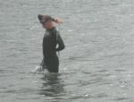 Nun zwängten sich wohl 80% der Starter in die wärmende und beim Schwimmen Vorteil bringenden Neoprenanzüge. Drei der vier teilnehmenden Staßfurter versuchten es ganz mutig nur im Triathloneinteiler. Nun ging es in drei Startwellen zu je ca.100 Starter ins Wasser(18°C), das sich als wärmer als die Lufttemperatur(16°C) erwies. Bei Wind und Böen hatte man es schon schwer, sich im Wasser zu orientieren und irgendwie hatte man bald kein Gefühl mehr in den Zehenspitzen.