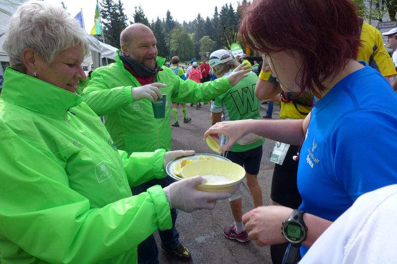 Der aufkommende Hunger wurde an der Verpflegungsstelle "Grenzwiese" traditionell mit Haferschleim besiegt. Es gab aber auch Stullen mit diversen Aufstrichen, Obst, Kuchen und natürlich ausreichend Wasser und warmen Tee. Die Männer aus den Reihen der Bode-Runners konnten der Versuchung nur schwer wiederstehen, war die Erinnerung an heftige Magenprobleme bei der 42. Auflage des Rennsteiglaufes doch noch nicht vergessen. Und überhaupt musste nun langsam Fahrt aufgenommen werden, galt es doch die damalige Zielzeit von 09:16 Stunden zu unterbieten.