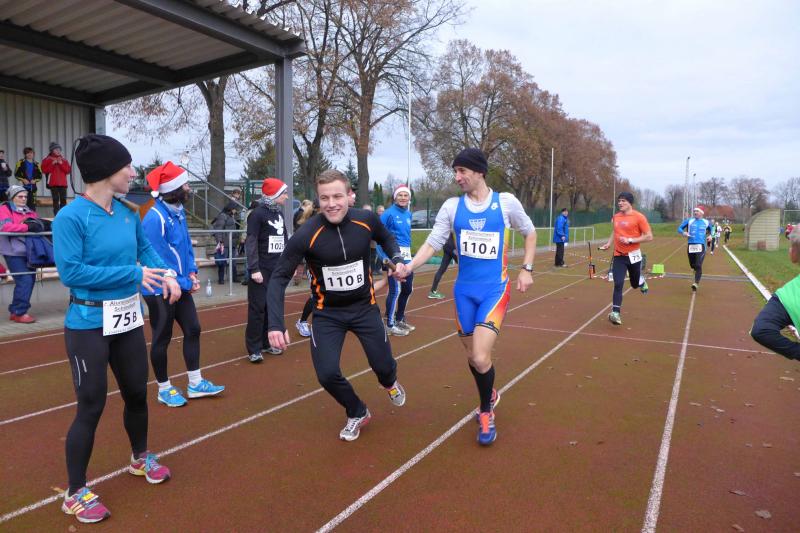 Der Wettergott meinte es wieder einmal gut mit den Bode-Runners der Gaensefurther Sportbewegung. Die neunte Auflage im Staßfurter Stadion der Einheit konnte problemlos gestartet werden und mit fast 100 Teilnehmern wurde es auf der Tartanbahn auch so bunt, wie es sich die Organisatoren gewünscht hatten. Krankheitsbedingt minimierte sich der Lauf über 200 Meter der Vorschulkinder auf nur wenige mutige Starter. Eingewiesen vom Nikolaus höchstpersönlich, vertraten sie ihre Altersgenossen aber prächtig. Erstaunlich fit präsentierten sich die Sechs- bis Zehnjährigen Zweier-Teams. Nach einer Erwärmung mit dem Nikolaus, bei der auch die Lachmuskeln nicht zu kurz kamen, lieferten sich die Mädchen und Jungen über 15 Minuten ein spannendes Kopf- an Kopfrennen. Nur das Ausmessen der letzten Meter besiegelte am Ende die hart umkämpften Platzierungen zwischen der Grundschule Hecklingen und der Gaensefurther Sportbewegung.