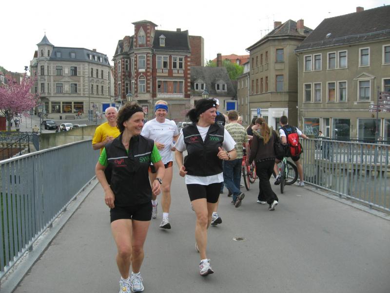 Nachdem sich zu früher Stunde bereits eine große Gruppe von Läufern der beteiligten Laufgruppen vor der Gaensefurther Schlossbrunnen Wüllner GmbH eingefunden hatte, verabschiedete deren Geschäftsführer Horst Braunisch die Teilnehmer, nicht aber ohne ihnen einen PKW voll mit erfrischendem Naß mit auf die Reise zu geben. Über die Roßbahn ging es dann zur 1. Etappe nach Staßfurt zu den Stadtwerken, wo die Läufer schon von OB René Zok und Betriebsangehörigen erwartet wurden. Die Übergabe der Staffelstäbe und die Einnahme einer kleinen Wegzehrung hingegen mussten zügig abgewickelt werden, hatte man doch durch einen Termin bei der LAGA in Aschersleben einen straffen Zeitplan vorgegeben. Wenn die Landesgartenschau für die älteste Stadt Sachsen-Anhalts das absolute Highlight des Jahres ist, warum nicht auch in den diesjährigen Stadtwerkelauf einbinden, dachten sich die Läufer von Ascania Aschersleben und sorgten damit für eine nette Bereicherung der Tagesplanes. Bei warmen, aber angenehmen Wind ging es weiter nach Bernburg, entlang der Bode und der Saale, deren Auen sich frühlingshaft geschmückt zeigten. Schon allein dieses Flair entschädigte für so manche Strapazen. In Bernburg bei den Stadtwerken angekommen, folgte dann der gewohnt herzliche Empfang mit Übergabe der Grußbotschaften, ergänzt durch einen leckeren Imbiß und weiter ging’s. An Verpflegung unterwegs mangelte es ebenfalls nicht. Die von Gaensefurther gesponserten Getränke und die Lunchpakete vom Speiseservice RiRo ließen diesbezüglich fast keinen Wunsch offen. Hatte trotz alledem ein Aktiver konditionelle Probleme, konnte er sich in einem der vier Begleitfahrzeuge erholen. 2 Sportler mussten leider ihren Plan, die gesamte Strecke durchzulaufen, nach 50 km aufgeben, denn das hohe Lauftempo forderte seinen Tribut. Bei dieser Eile übersah dann in den engen Promenaden von Aschersleben prompt ein Läufer einen Poller und es kam zu einer schmerzhaften Kollision. Aber zum Jammern blieb wenig Zeit, denn die Landesgartenschau wartete. Auf der Bühne im Weingarten war dann einige Prominenz versammelt und mittendrin unsere Helden mit den flinken Beinen, überwältigt vom folgenden Blitzlichtgewitter. Nachdem die eigentliche Mission des Laufes, die Übergabe einer Grußbotschaft auch an die Stadtwerke Aschersleben abgehandelt war, die die gute Zusammenarbeit auf kulturellem, wirtschaftlichen und natürlich sportlichem Gebiet dokumentieren soll, folgte die letzte Etappe der insgesamt 70 km langen Strecke.