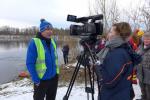 Das kalte Wetter hätte an diesem Tag nicht besser sein können, denn der See war in Ufernähe mit einer zwei Zentimeter dicken Eisschicht bedeckt. Ein Rettungsschwimmer, der in einem dicken Neoprenanzug steckte, hatte gut zu tun, für die Eisbader eine kleine Badestelle freizulegen. Inzwischen füllte sich das Gelände mit reichlich Zuschauern, zwischen denen wohl so einige Eisbader stecken mussten. Nach und nach outeten sich die Mutigen durch ihre lustigen Badetextilien, oder Badeschuhe, sogar Styroporplatten gegen die Bodenkälte kamen zum Einsatz. Jeder hatte seine eigene Taktik, sich auf die eisigen Sekunden oder Minütchen im kalten Eiswasser vorzubereiten. Nach einer kleinen Ansprache auch mit dem Appell es bitte nicht zu übertreiben, erfolgte eine Erwärmung bei flotter Musik. Oberstes Gebot beim Eisbaden ist nämlich, nicht kalt in das Wasser zu gehen.